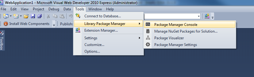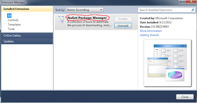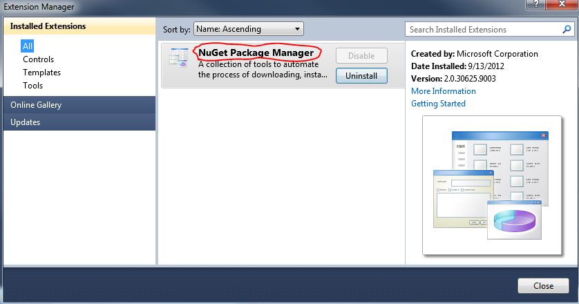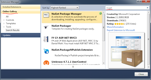 Если NuGet Package manager не установлен, то ищем его в Online Gallery и устанавливаем